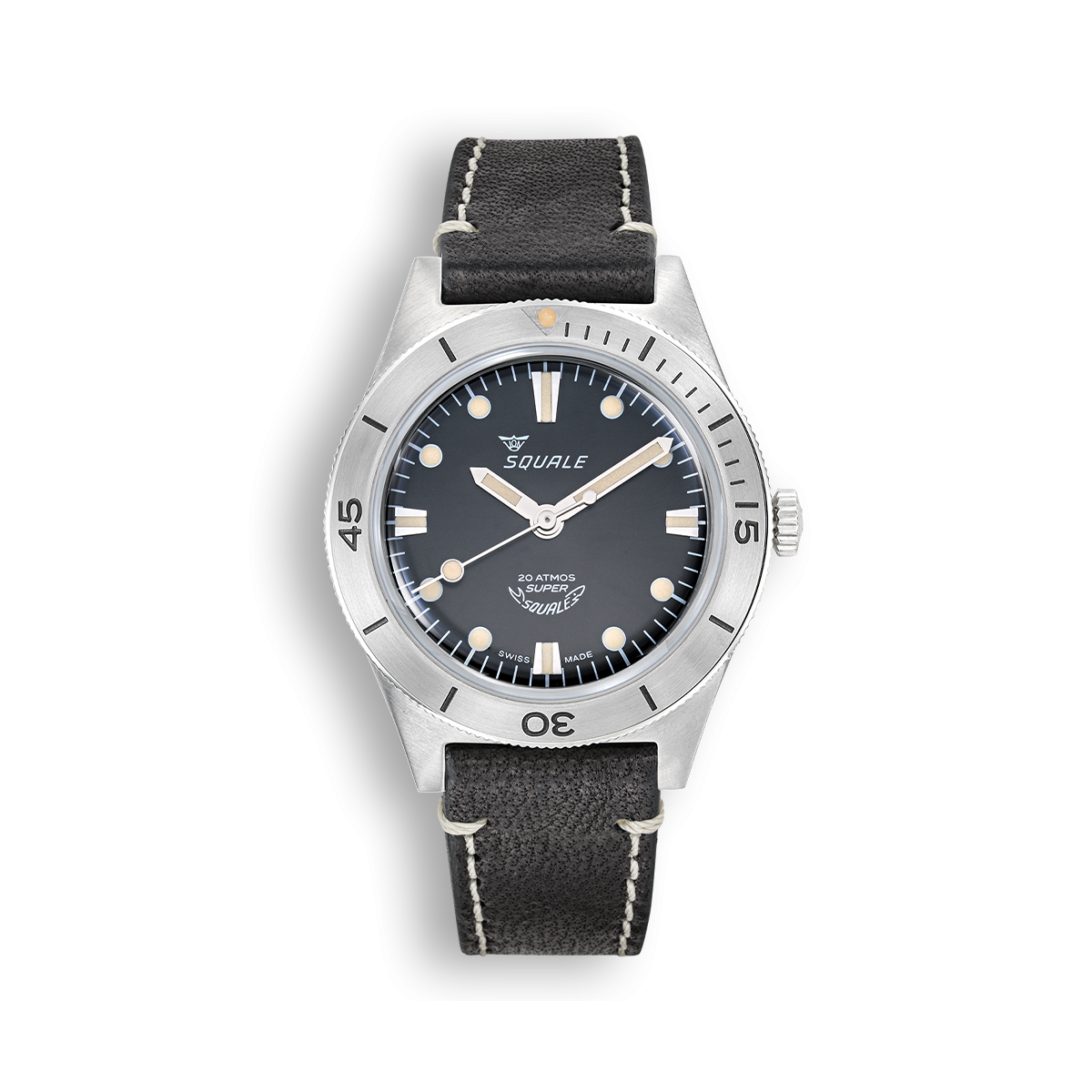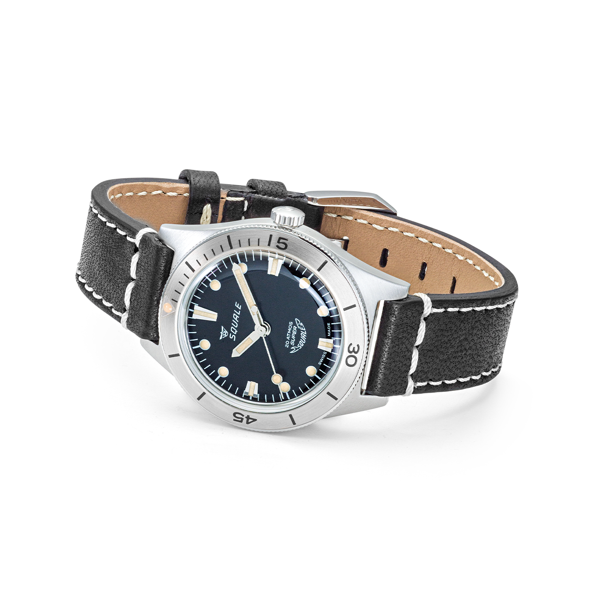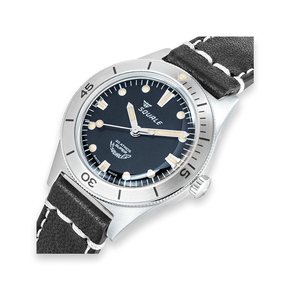 Il modello Super Squale nasce come un vero e proprio skin diver: con resistenza all’acqua di 200 metri, 38 millimetri di diametro cassa e solo 45mm di lunghezza, il Super Squale è stato pensato per essere il meno ingombrante possibile durante le immersioni, con o senza la muta.
