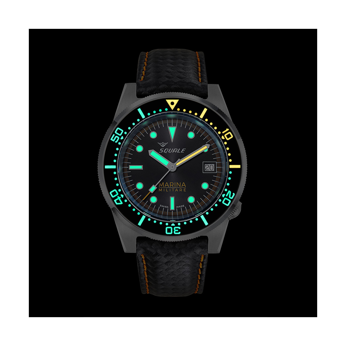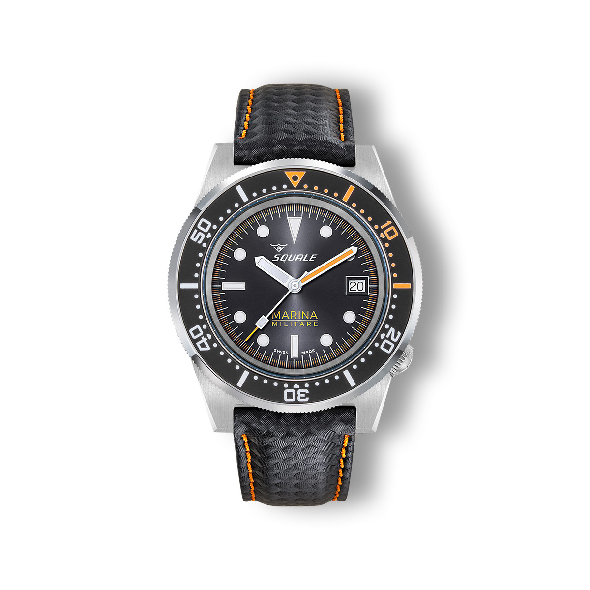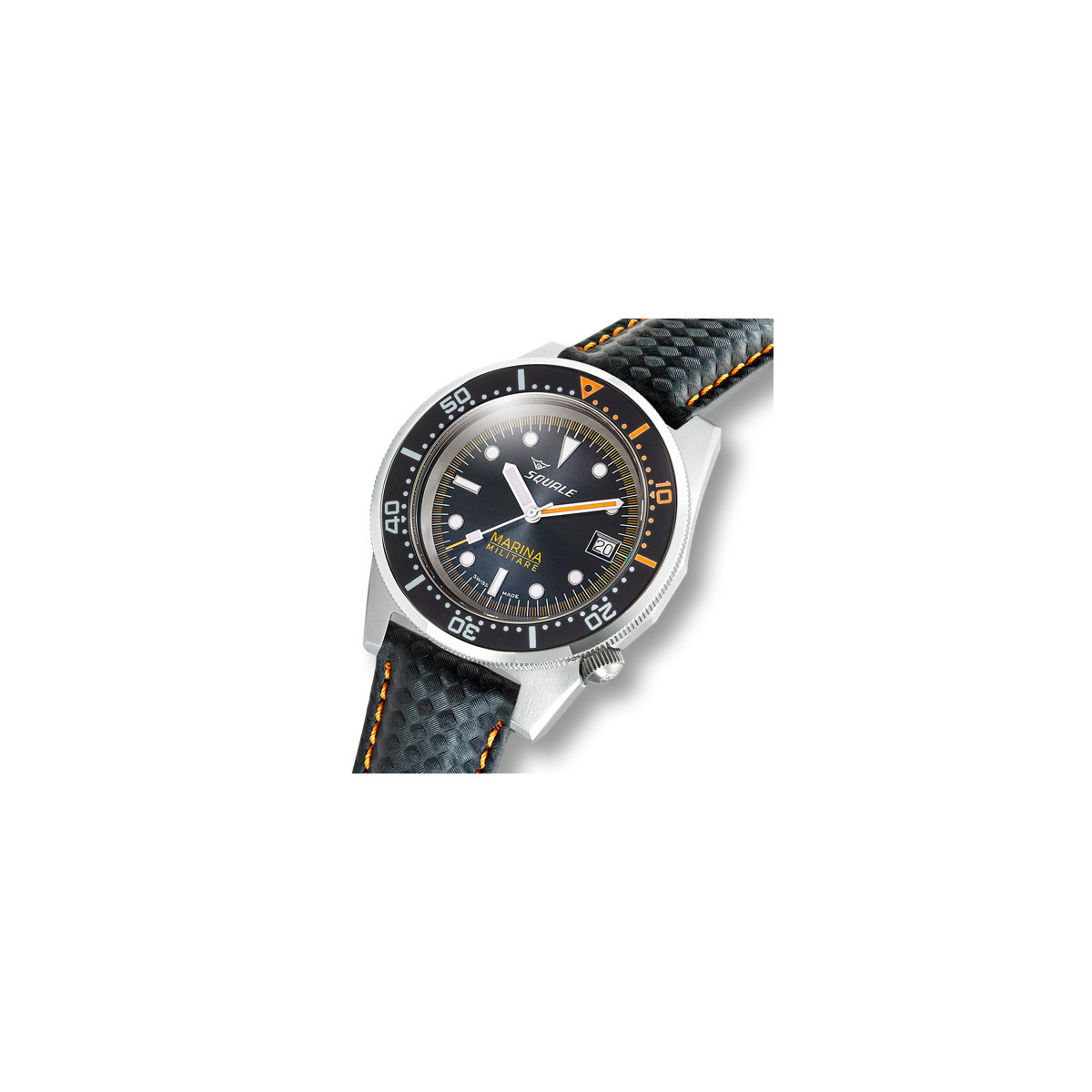 Per completare la funzione operativa di questo orologio, il 1521 Marina Militare è accompagnato da un cinturino in microfibra nera con cuciture arancioni, resistente all’acqua e alle immersioni. È inoltre fornito di un cinturino aggiuntivo in gomma naturale nera marchiato Squale.